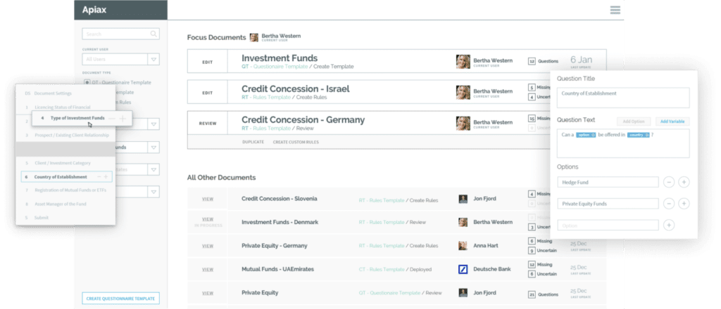 Apiax is a regtech company that builds a lean yet comprehensive solution to transform Banking’s complex regulatory landscape into digital and centralized rules and to manage the full lifecycle of digital regulations.